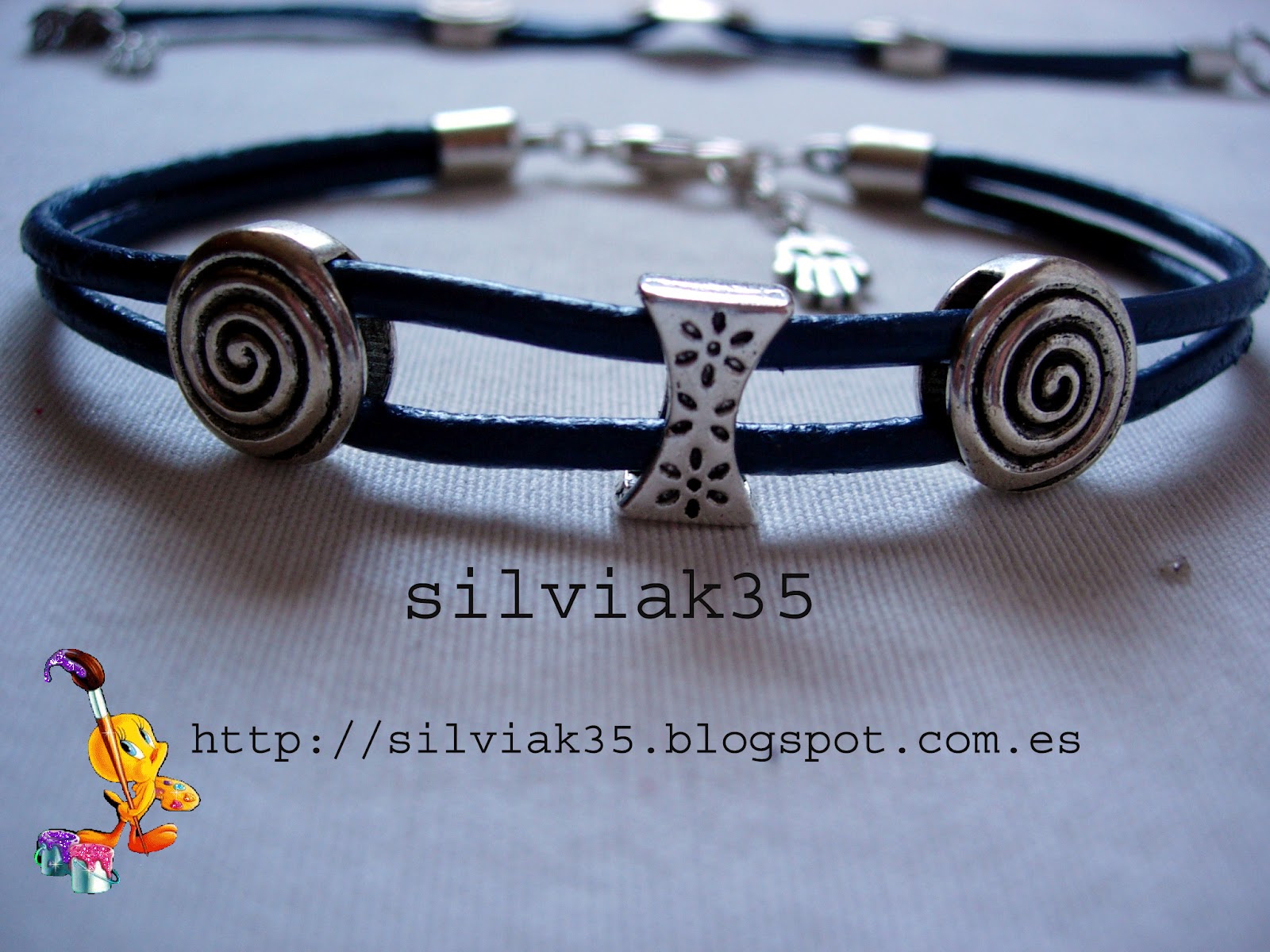 pulsera cuero regaliz marrón oscura con fornituras y cordón cuero azul marino |